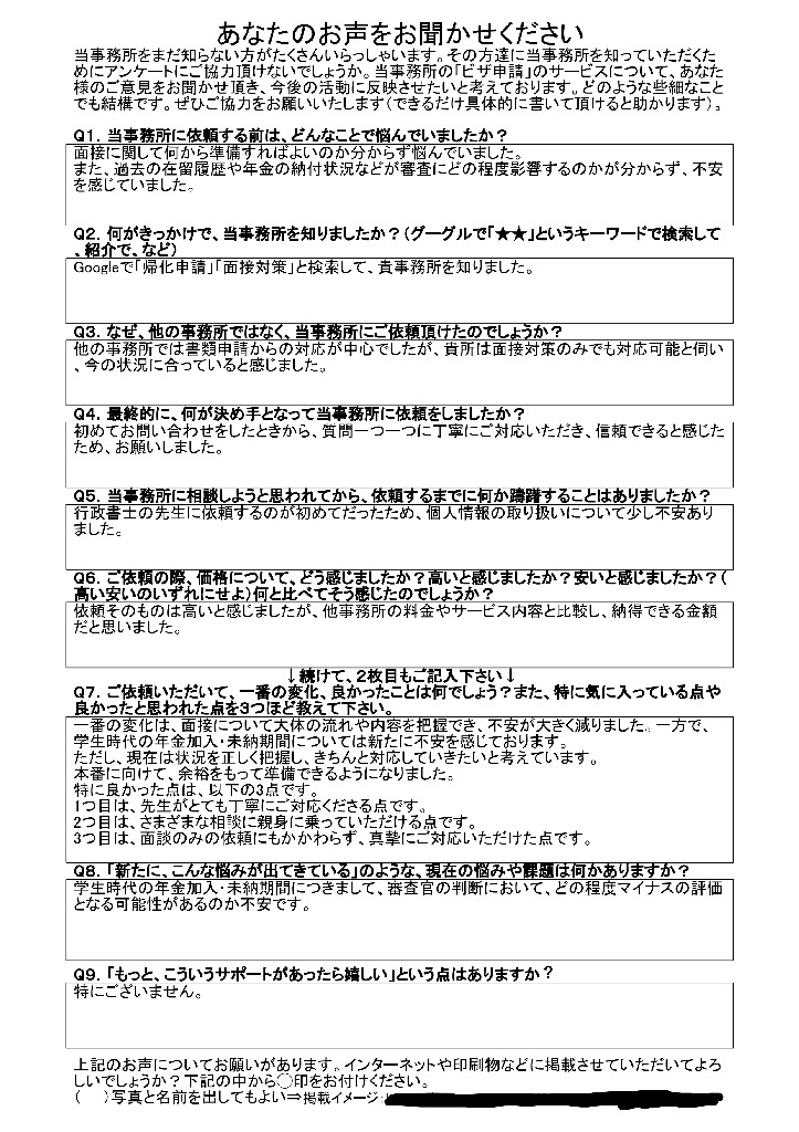 帰化申請をサポートさせていただいたお客様から、うれしいコメントをいただきました。私も皆様の日本での活躍のご支援をさせていただくことはとても光栄です。