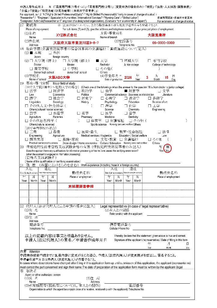 行政書士が作成した技人国への在留資格変更許可申請書(留学から技人国)の記載例を掲載しています。