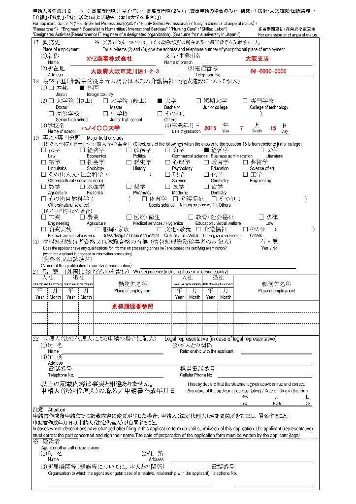 行政書士が作成した技人国の在留期間更新許可申請書の記載例を掲載しています。