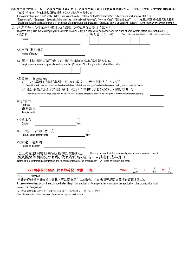 ⑪の項目は派遣社員として派遣先で働く場合に記入する必要があります。記入する内容は自分が雇用されされている派遣元の情報ではなく実際に自分が働く派遣先の会社の情報を記入してください。派遣元の情報は所属機関等作成用1の方に記入します。