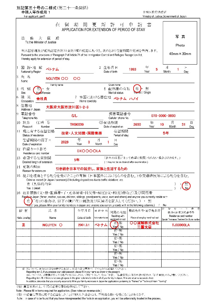 | ⑯在日親族(父・母・配偶者・子・兄弟姉妹・祖父母・おじ・おばなど)及び同居人 | 妻、NGUYEN 〇、2001.3.1、ベトナム、同居有、○○運輸株式会社三国支店、TJ00000LA | 日本に家族・親戚・一緒に住んでいる人がいる場合は、在留カードを確認させてもらい、氏名・生年月日・国籍・地域・同居の有無・勤務先名称・通学先名称・在留カード番号を記入します。いない場合は「なし」 |